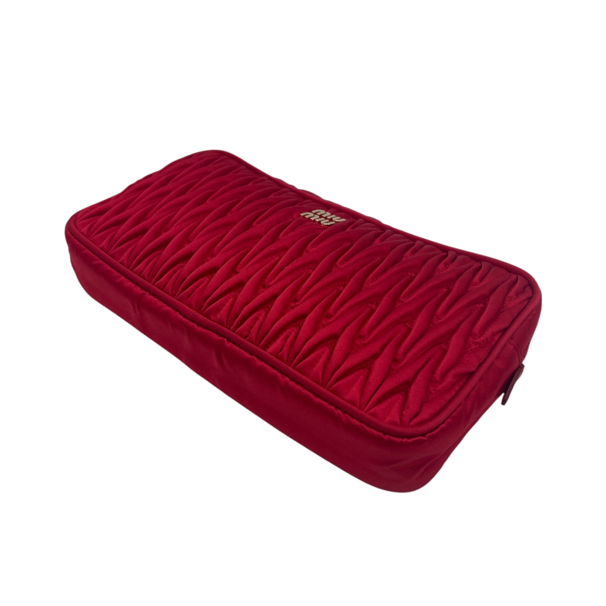 Pochette Cosmetique Miu Miu in tessuto rasato, colore rosso. Dettagli in metallo dorato. Chiusura con cerniera superiore. Diversi scomparti interni, utilizzabili anche separatamente. Misure 26 cn x 12 cm x 4 cm