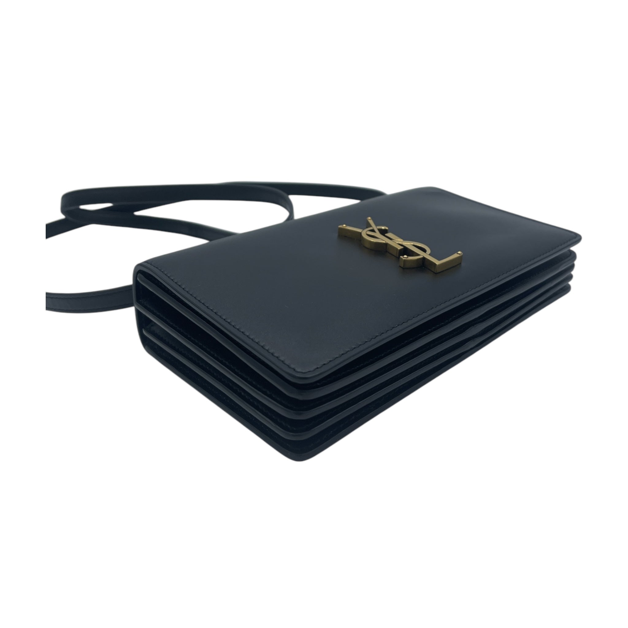 Borsa Ysl in pelle liscia nera. Con metalleria in oro brunito. Tracolla in pelle scorrevole, da portare a spalla o a tracolla. Chiusura con bottoncino. Logo Ysl Intrecciato sulla patta frontale. Diversi scomparti interni. Misure 21 cm x 12 cm x 5 cm
